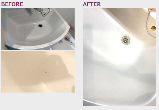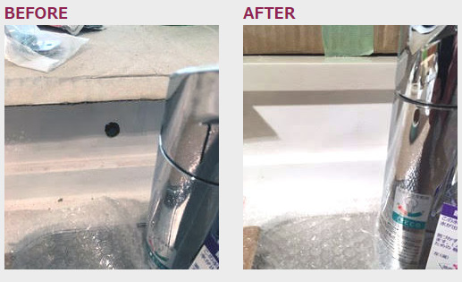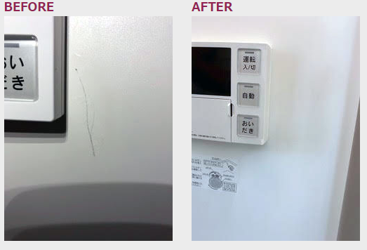 新築マンションの完了検査前に見つかった浴槽パネルキズ。バスユニットメーカーの担当者も見守る中、1時間ほどで完了。一時は交換まで考えていたそうですが、納期、費用の面で大幅な軽減を図ることができました!