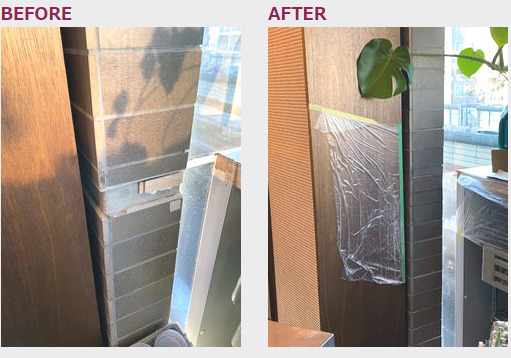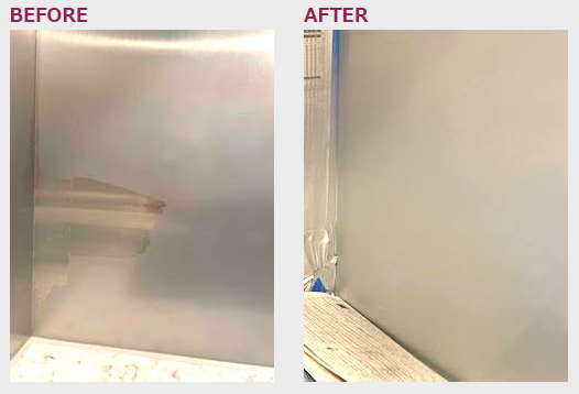 キッチンパネルの養生を剥がしたら、まさかの状態に!リフォーム工事中に貼っていた養生テープを剥がしたところパネルがこんな状態に!交換しかないと言われる中、ご相談頂き復旧しました。