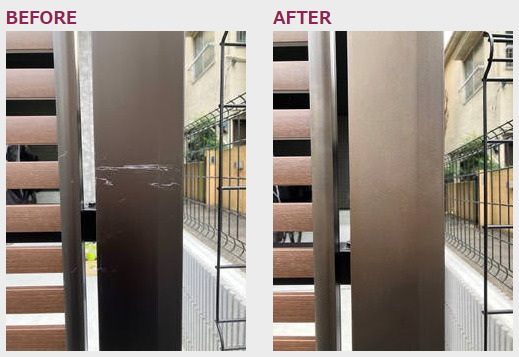 新築3ヶ月のアルミ製駐車場ゲートにつけられた無惨なキズ。オーナー様からは、ホームページから検索いただき、半日で完了しました。