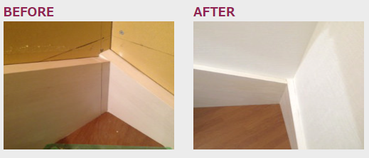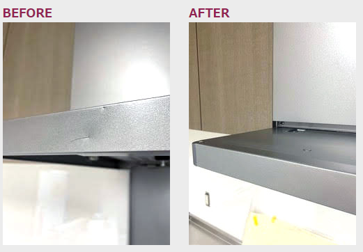 キッチンカウンターに粘着テープ式フックを無理に取ろうとしてできた剥がれ。管理していた大手不動産屋さんは、「交換しかない」との判断でしたが、当方で対応。次の入居者様には、まったく判別できない仕上がりに!パネルの交換には、まったく同じ色柄は既になく多額の費用がかかるところでした。