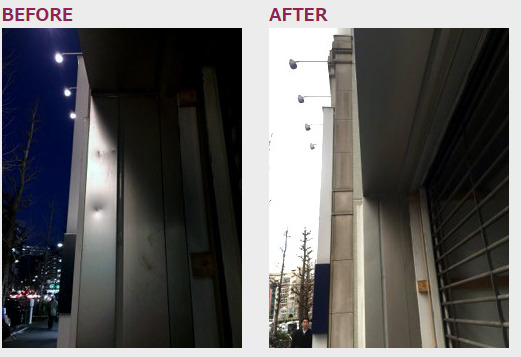 打ち込みのあったサッシファサード部分の回復工事。美しい入口は、新たなテナント募集に重要なポイントです。