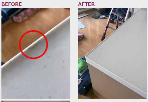 リフォーム工事中に発生した既存キッチン人大天板の欠け。小さな欠けでもそのままでは、やはり目立ちます。お客様への信用も失墜するところですが、当方で補修。翌日にはお引渡しが無事に終わったとの報告を頂きました。