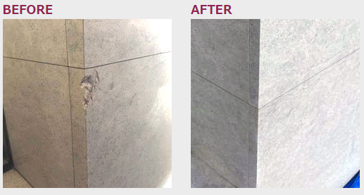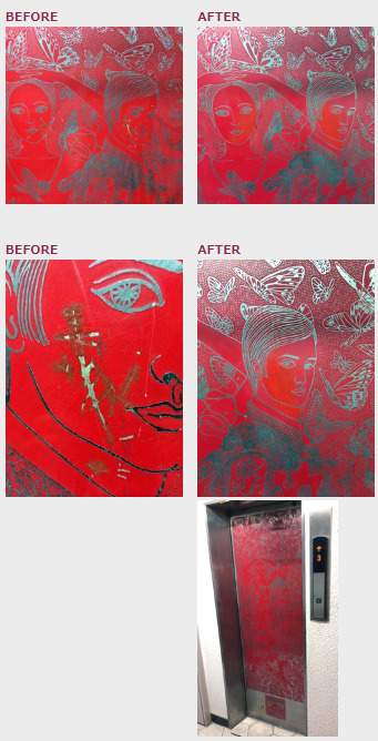 エントラス部分の美しい模様画の顔部分に心ないキズをつけられてしまったとのご相談。目線位置のキズで待ち時間には、気になる箇所、美しく補修完了し管理組合様よりお褒めのお言葉を頂きました。