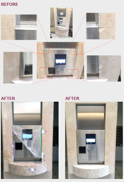 大規模マンション改修工事現場、セントラルインターホーン交換の際に生じた数々の大理石欠損。全面交換をすることなく補修対応可能です。機器そのものの入れ替えもあり玄関周りが美しくなりました。日々、人目に触れる場所だけに周辺部との調和に視点を置いての補修でした。費用と材料にエコです!気になっていたシミ部分も除去させて頂きました。