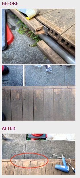 高級マンションの外壁工事中に落下物によるウッドデッキを破損