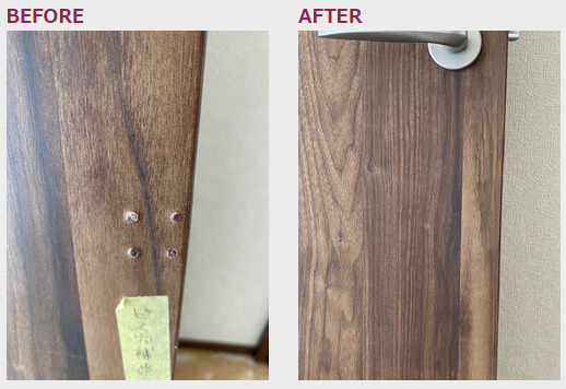 周辺の色調、凹み、雰囲気に合わせて感動の仕上がりに大満足のお施主さま。追加でほかのドア3枚のリペアのご依頼も頂きました。